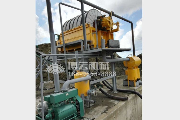 盤式真空過濾機由各個單獨的扇形片的圓盤構成。每一個扇形片為單獨的過濾單元,由濾布做成布套在扇形片上形成濾室。過濾盤由電機通過減速器及開式齒輪傳動來驅動,過濾盤順時針方向轉動,濾室里的礦漿在吸附區借助于真空泵在過濾介質兩側形成的壓力差,附著在過濾盤上形成濾餅后,攪拌器旋轉防止固體沉淀,濾餅離開液面后,在真空作用下繼續脫去水分。濾液透過濾布,經過濾液管,從分配頭排出。濾餅在卸料區由反吹風卸料落入排料槽,整個作業過程連續循環進行。